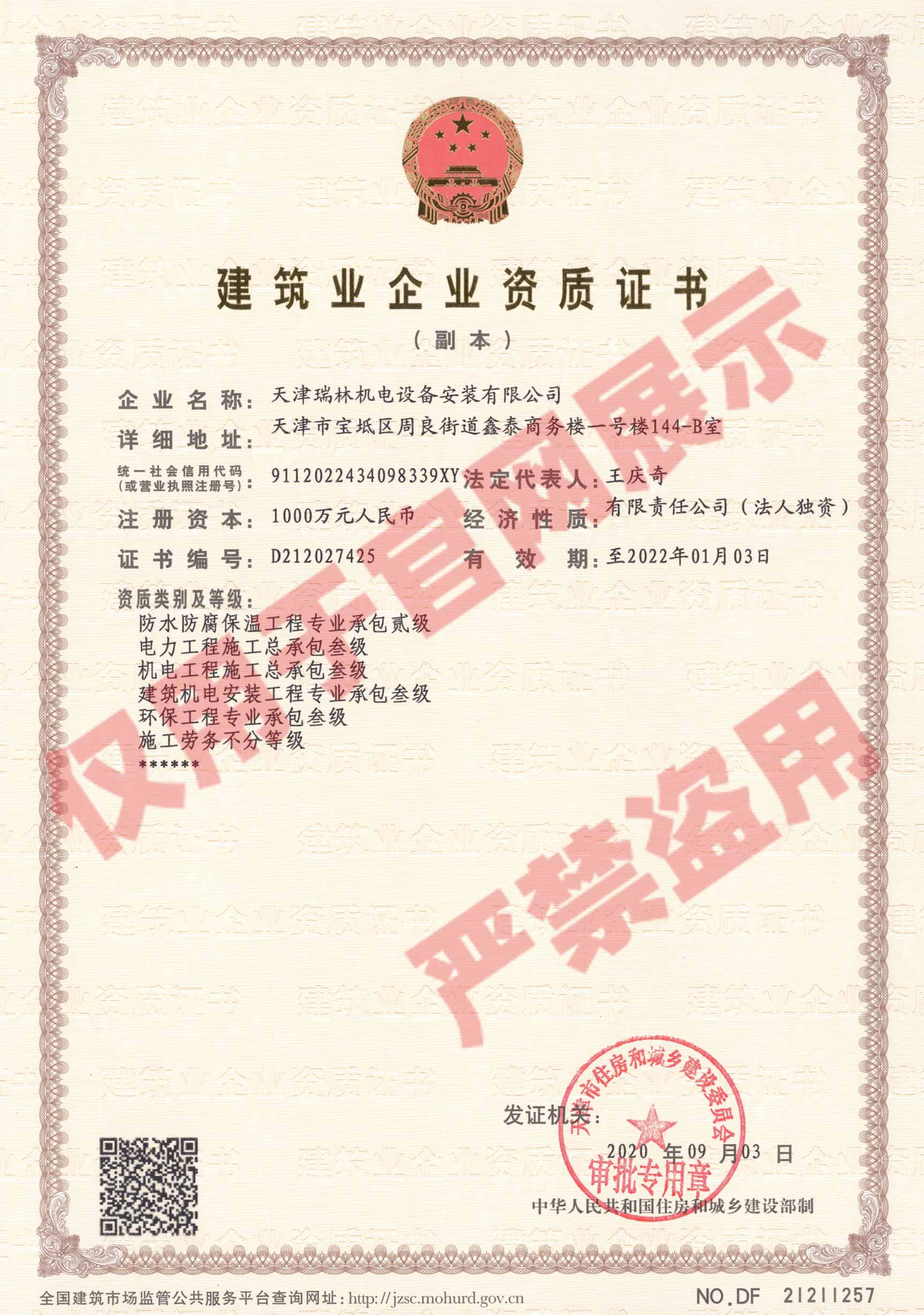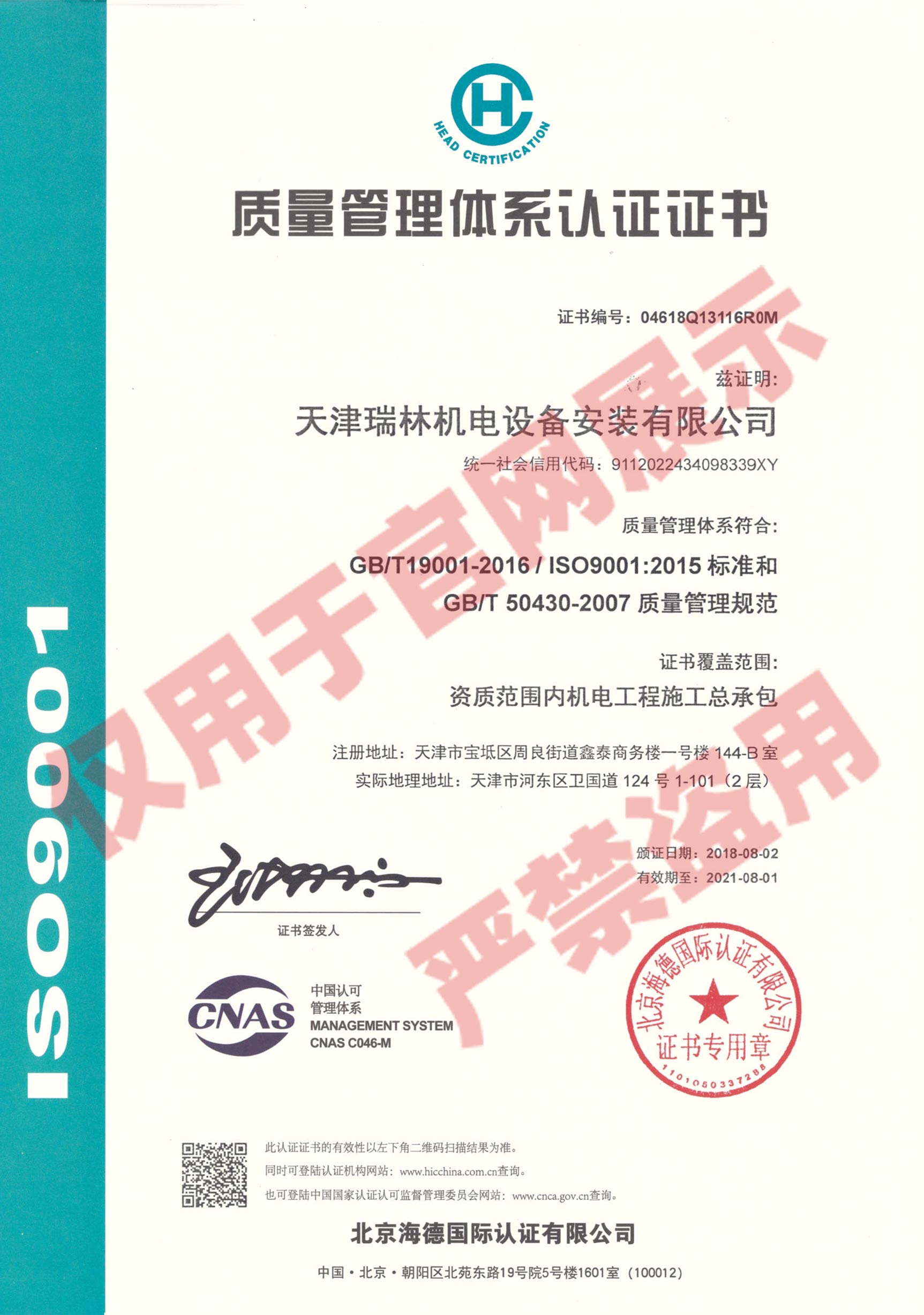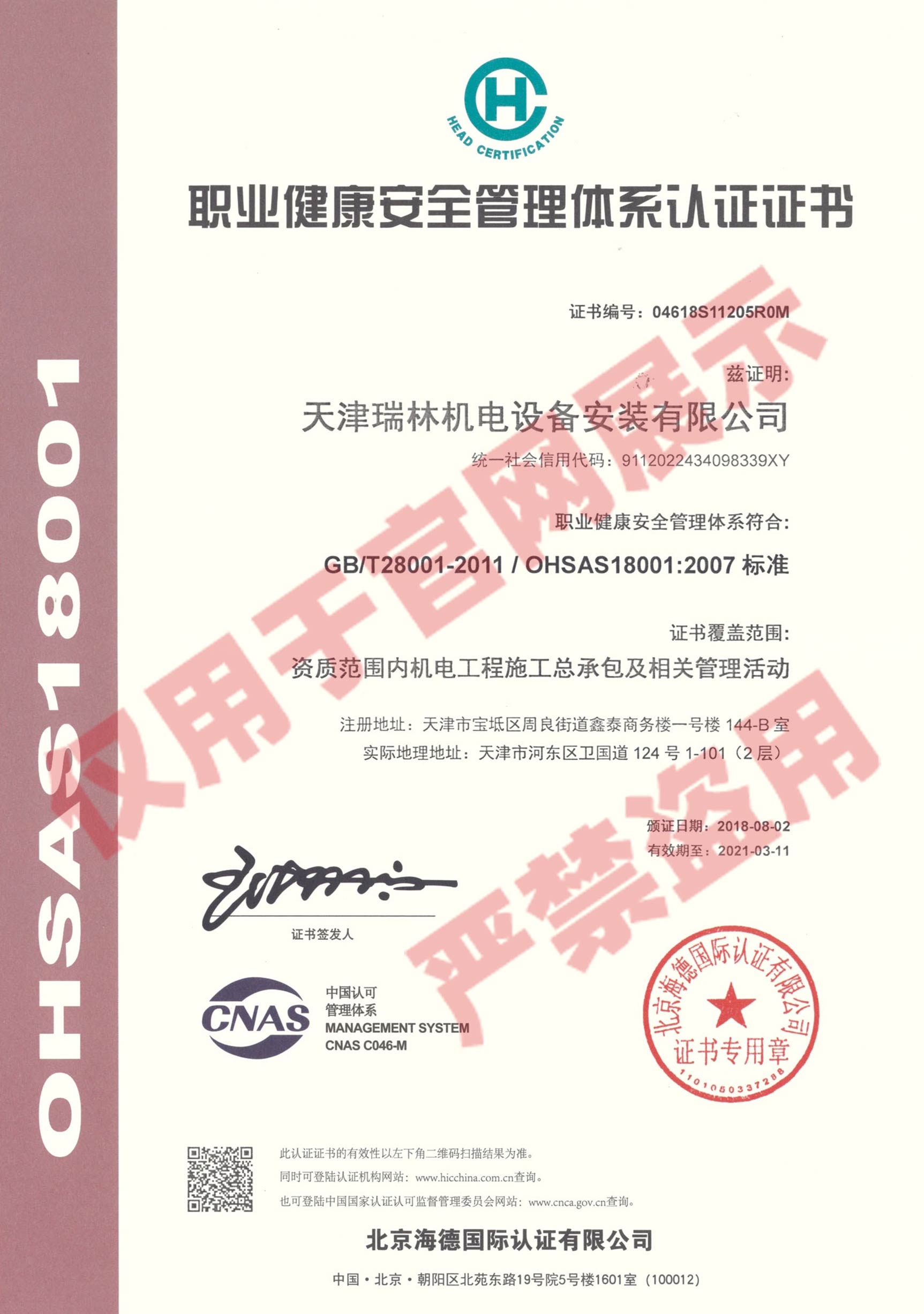 公司目前擁有電力工程施工總承包三級、機電工程施工總承包三級資質(zhì)、建筑機電安裝工程專業(yè)承包三級資質(zhì)、環(huán)保工程專業(yè)承包三級資質(zhì)等,2017年獲得安全生產(chǎn)許可證,2018年公司通過 OHSAS18001安全體系認證,ISO19001質(zhì)量體系認證、ISO14001環(huán)境體系認證三貫標(biāo)。